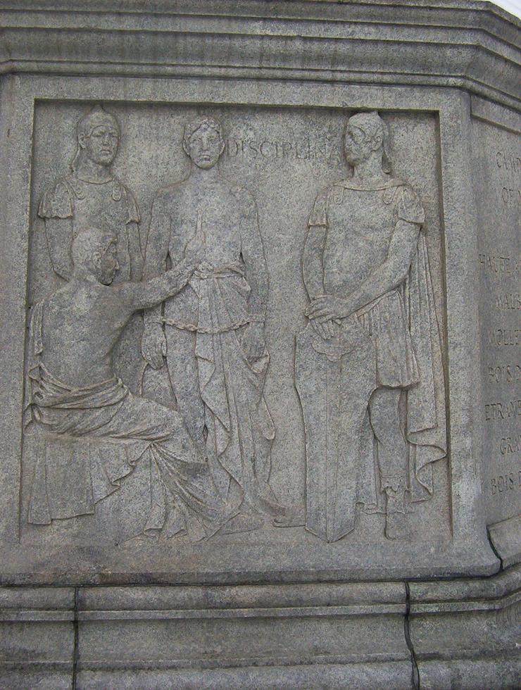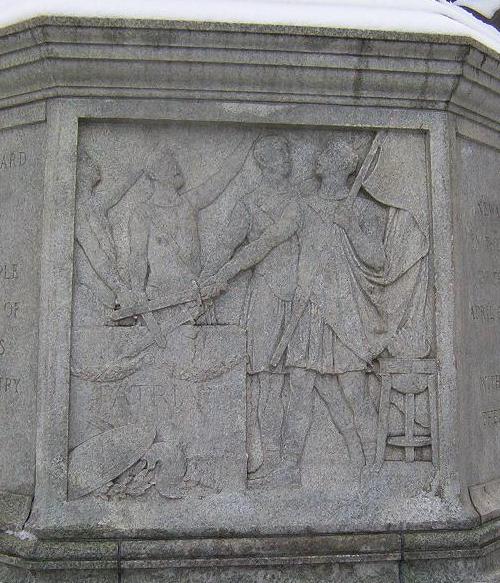 The base of "Planting the Standard of Democracy" was designed by the architectural firm of Richfield and Rogers. Each of the eight panels contains a written inscription or a bas-relief. The four bas reliefs are entitled Patria, Sacrifico, Disciplina,and Fraternitas | ||||||||