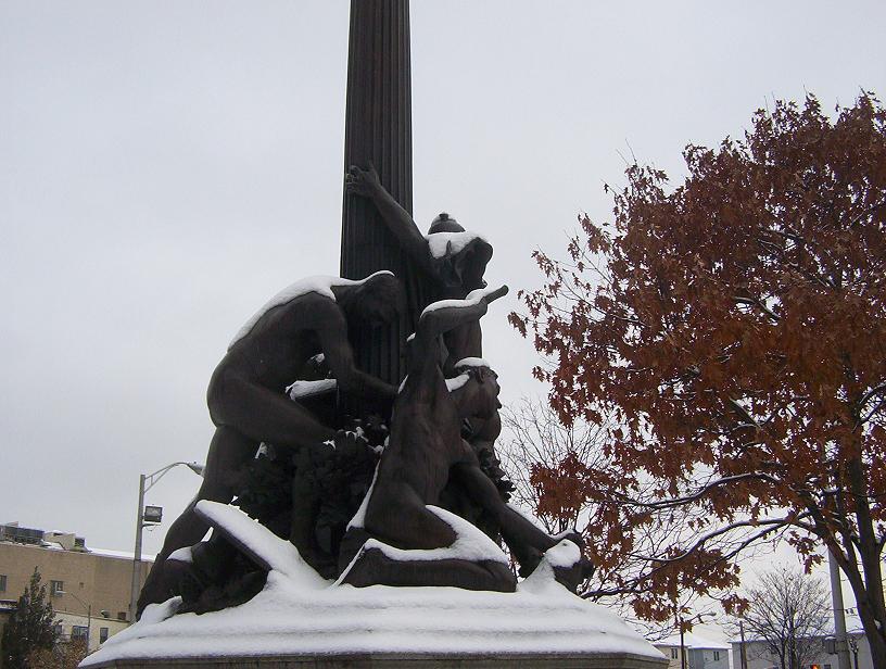 If any statue in Newark rivals "An Historical Incident of November, 1764" for awkwardness of title, it might be "Planting the Standard of Democracy," also in Lincoln Park, located where Broad Street and Clinton Avenue meet. Although it depicts Romans, and not doughboys, "Planting the Standard of Democracy" was Newark's official memorial to each of its 20,863 soldiers and sailors of the Great War.   |