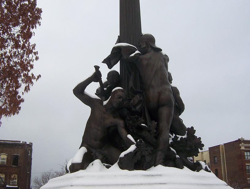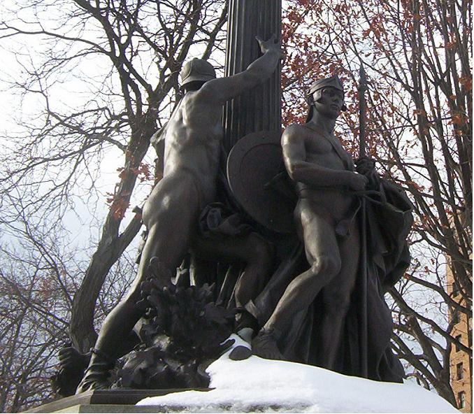 The sculptural group for "Planting the Standard of Democracy" was created by Charles Henry Niehaus. As Chauncey Ives sculpted Connecticut's contributions to Statuary Hall, Niehaus, a native of Cinncinnati, sculpted both of Ohio's contributions to Statuary Hall, James A. Garfield and William Allen. Locally, a major Niehaus piece are the Astor doors of Trinity Church, in Manhattan.While Chauncy Ives resided in Italy, Charles Niehaus lived in the United States (New Jersey, in fact). Niehaus, a German-American, did train in Germany though.   |